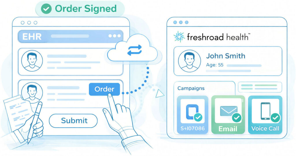 A provider signs the order initiating the connection between the EHR and Fresh Road Health. The EHR sends patient demographics to the Fresh Road Health portal, creating the patient profile in our system.